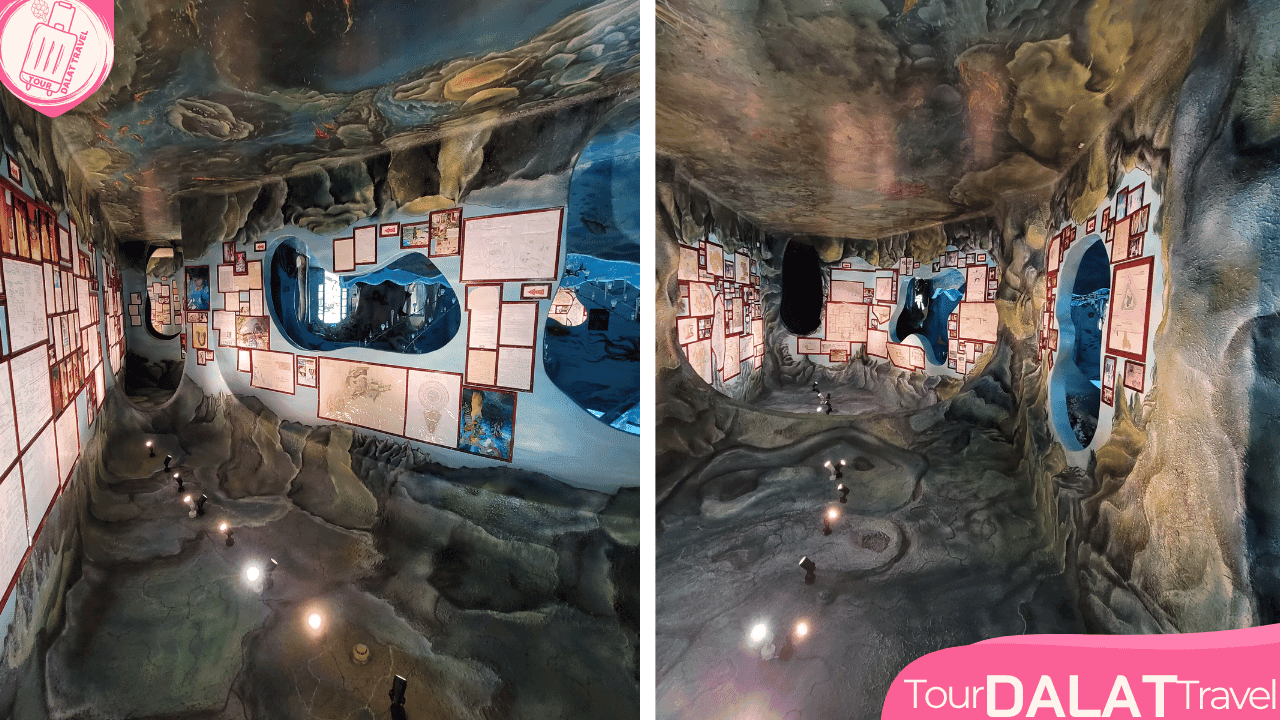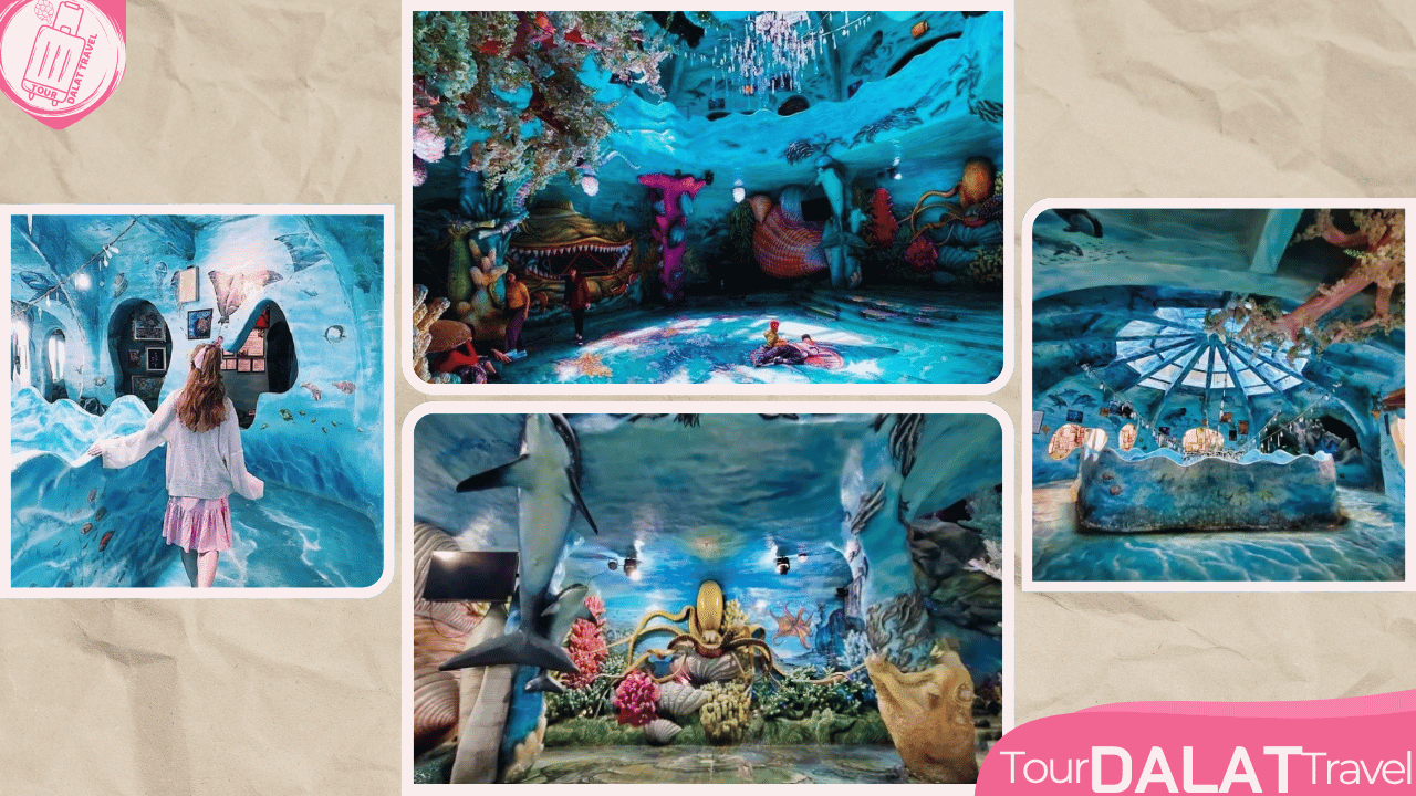 Không gian được thiết kế như một đại dương thu nhỏ với những mảng tường mô phỏng san hô, hang động uốn lượn, ánh sáng xanh mờ ảo phản chiếu tạo cảm giác huyền bí nhưng cũng rất sinh động.