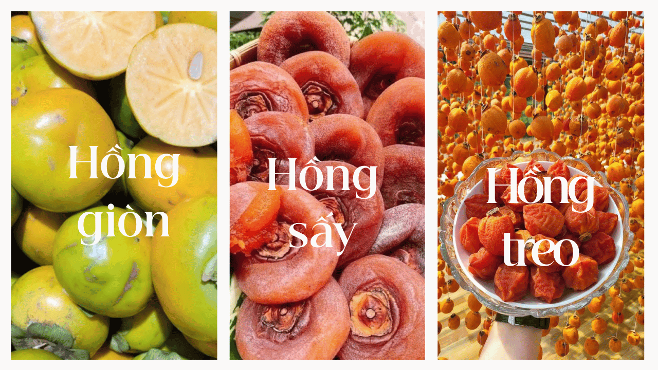 | Loại hồng | Hồng giòn | Hồng treo gió | Hồng sấy dẻo |
