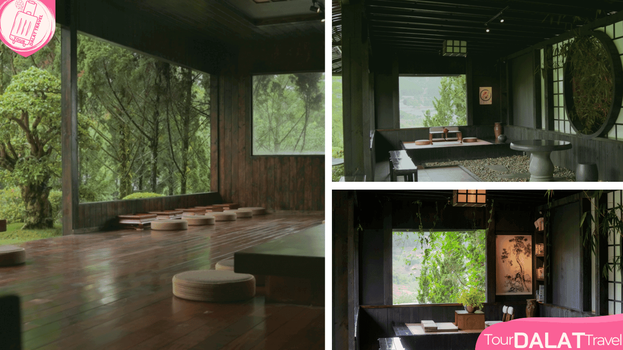 Sau khi dạo bước trong vườn bonsai hay check-in bên hồ cá Koi, du khách có thể dừng chân tại quán cà phê – trà đạo trong khuôn viên Quê Garden. Không gian nơi đây mở ra tầm nhìn bao quát cả vườn bonsai xanh mát, xa xa là đồi núi Đà Lạt thoáng đãng.