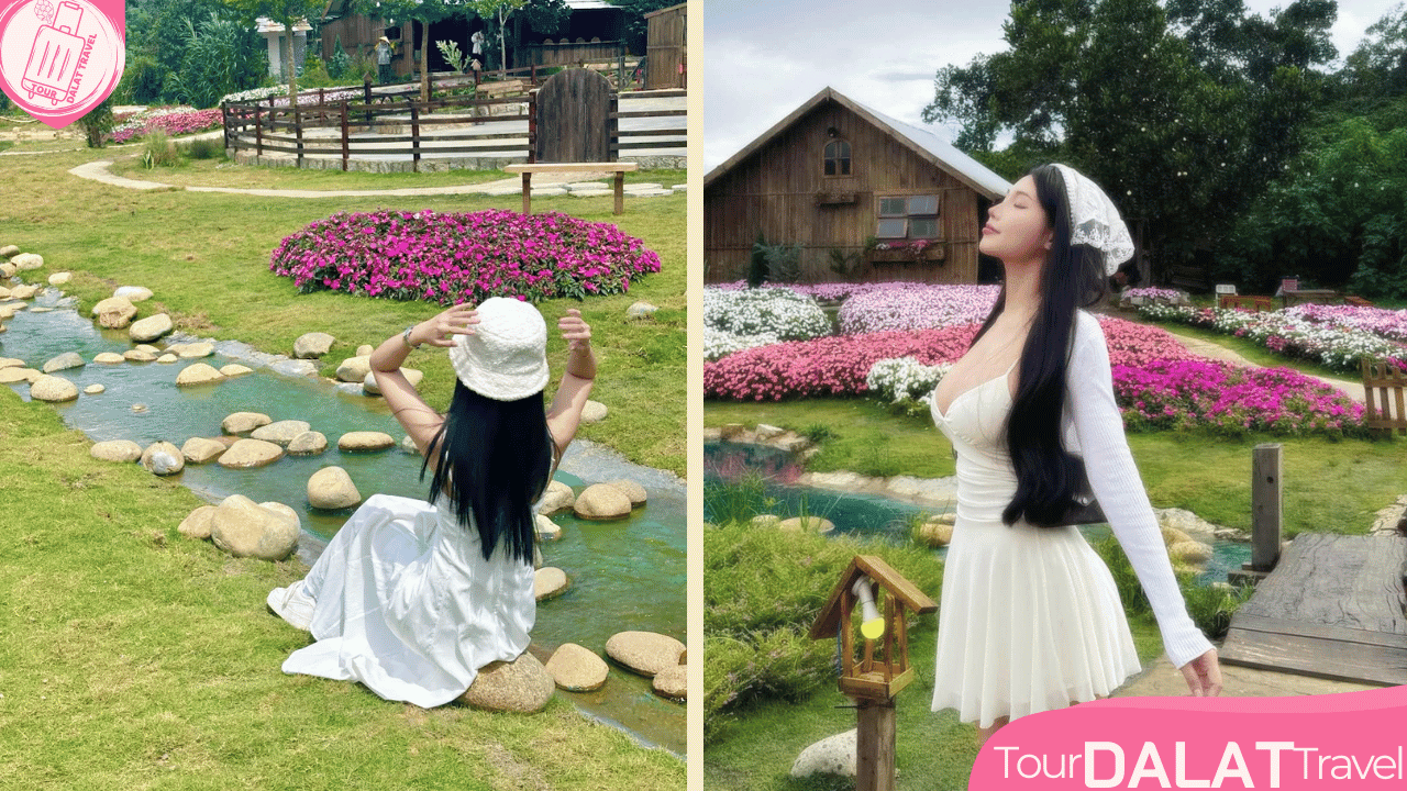 Du khách có thể tạo dáng bên ngôi nhà gỗ nhỏ xinh, lối đi lát đá quanh co, hàng rào trắng giản dị, hay giữa cánh đồng hoa khoe sắc. Vào những ngày nắng đẹp, ánh sáng vàng trải dài trên thảm cỏ và rừng thông càng làm bức hình trở nên lung linh, huyền ảo.